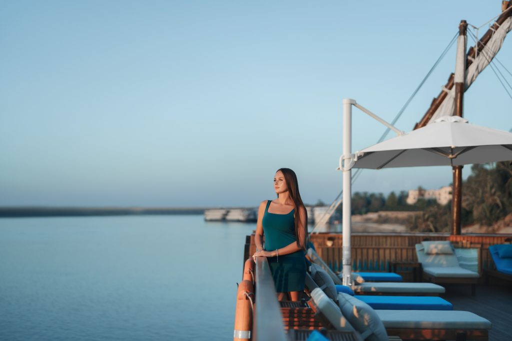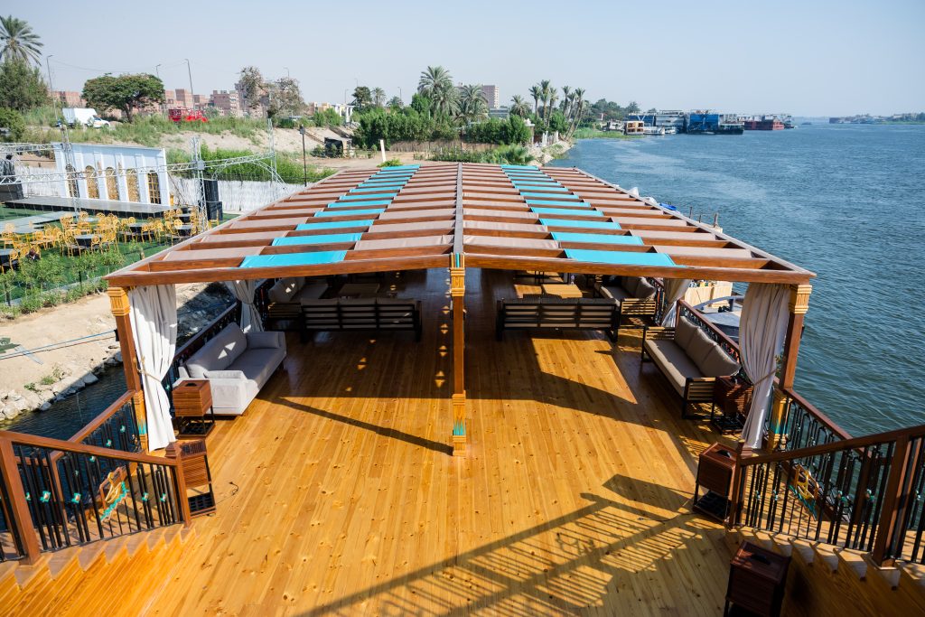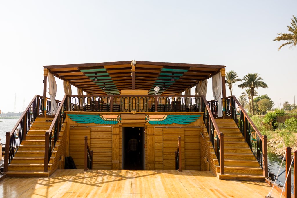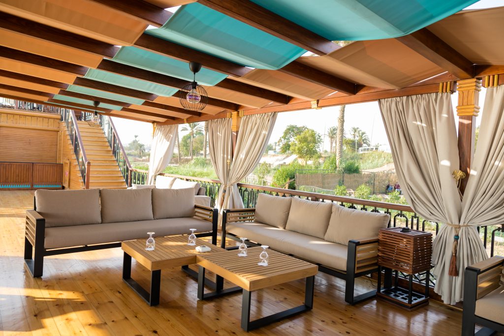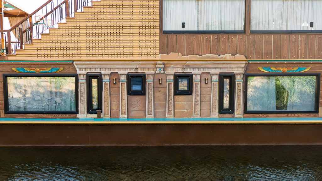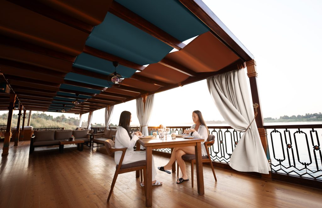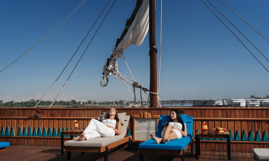 The interior design intricately weaves impressions from old Egyptian art into a visual tapestry. Inside, the cabins are meticulously appointed with premium materials and furnishings, providing an oasis of tranquility. The attention to detail extends to communal spaces, where carefully selected decor and state-of-the-art amenities create an atmosphere of refined opulence. The vessel’s construction adheres to the highest standards, ensuring not only aesthetic allure but also safety and durability for an enchanting and worry-free voyage along the majestic Nile. Embark on a majestic sailing experience along the timeless waters of the Nile. As the boat gracefully glides through the river’s embrace, the enchanting landscapes unfold, revealing the historical wonders and natural beauty that line its banks. The gentle rustle of the sails harmonizes with the rhythmic flow of the Nile, creating a serene symphony of nature. Sunlight dances upon the water, casting a golden glow that illuminates the historic monuments and lush greenery on the shores. Luxurious elegant cabins/suites with their large windows allows you to enjoy the peaceful sailing even when you are relaxing in your cabin. Staying on the spacious shaded sundeck will enable you to enjoy the gentle breeze, admiring the stunning scenery.