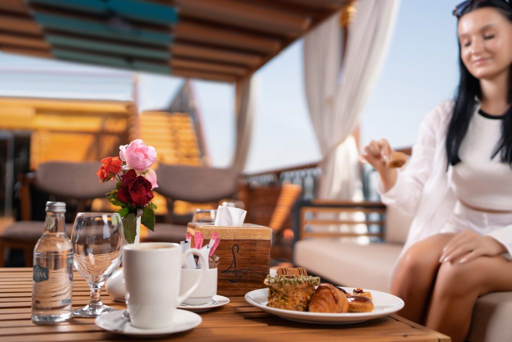Pair your meals with a curated selection of beverages, including refreshing cocktails, fresh juices, and freshly brewed coffee and teas. Whether dining al fresco under the stars or enjoying a cozy breakfast by the panoramic windows, every bite and sip is designed to enhance your journey, blending luxury with the romance of the Nile.